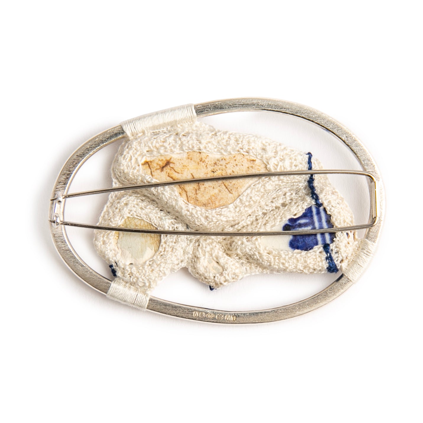 Tiny fragments of broken china are found everywhere on the foreshore of the River Thames - were they part of a bowl or cup, someone's prized crockery used for best occassions or an every day item? - who knows! But they've been handled & used, & somehow broken & then discarded, to be worn smooth by the action of the river over the years. Four tiny fragments of blue & white china have been stitched together, with the embroidery highlighting the blue pattern running through each piece. Once stitched together, the fragments have been stitched into a silver frame, approx 6 x 4cm, & have a stainless steel double brooch pin to make it wearable.
