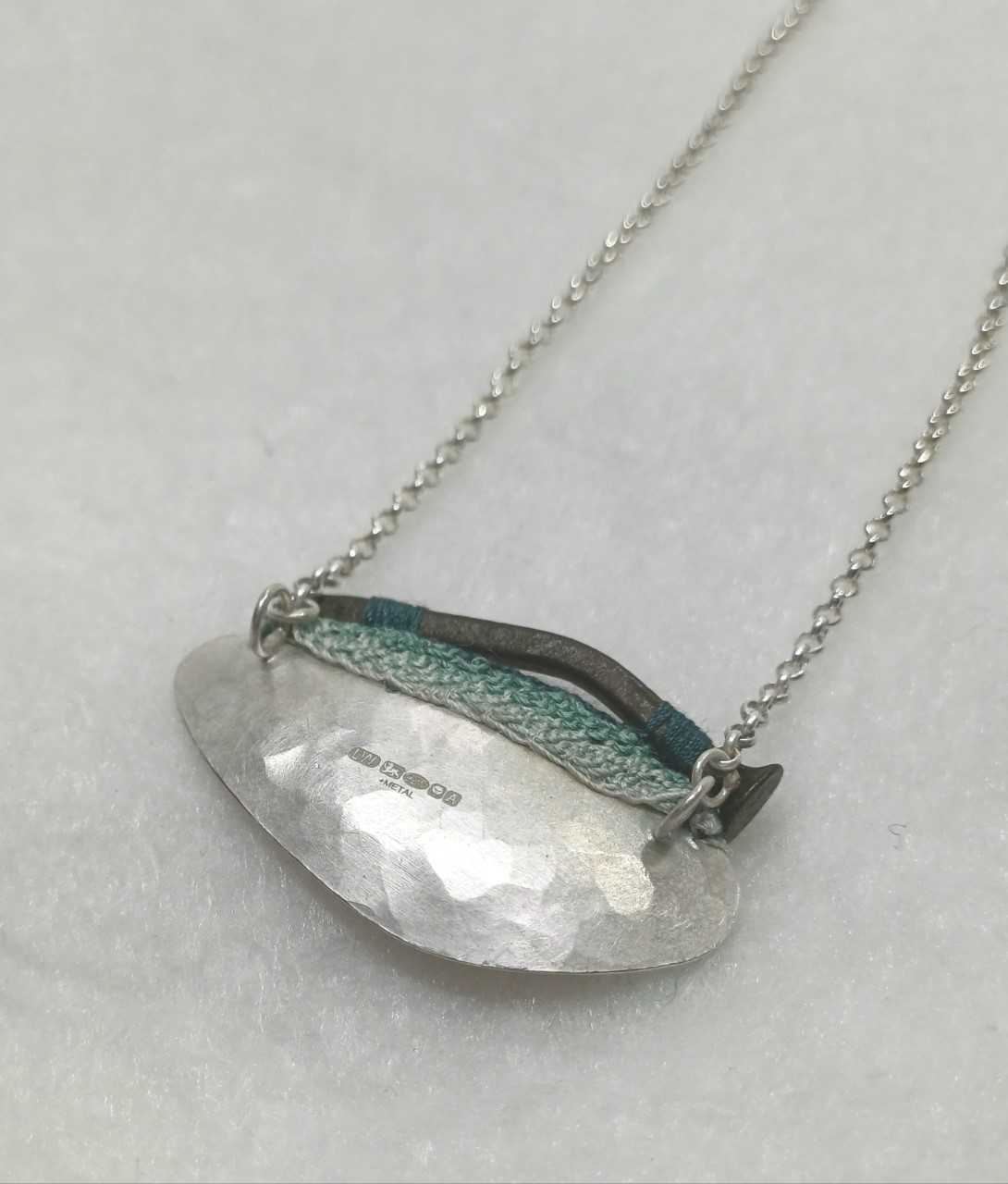 The nails I use for necklaces were handmade several hundred years ago before mechanisation, & come from mudlarking finds along the River Thames. They were used for boat building & for housing, although most of the nails I use come from an area that used to be used for ship breaking - who knows where these nails have been & what they've seen! The shape they are & their patina is how they're found, I form the silver shape, then handstitch the two together with silk threads. Necklaces can be commissioned in a variety of shapes & colours if prefered.