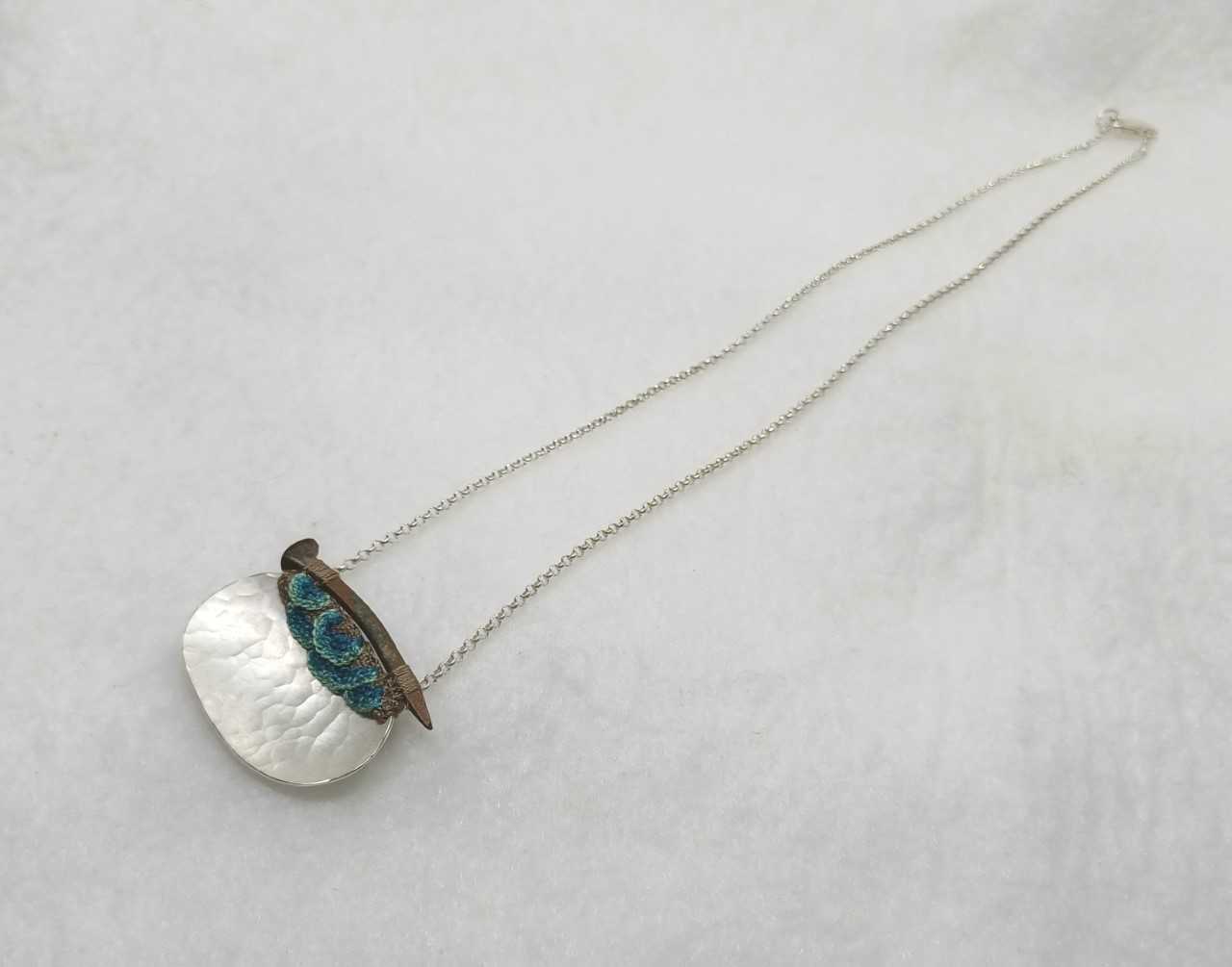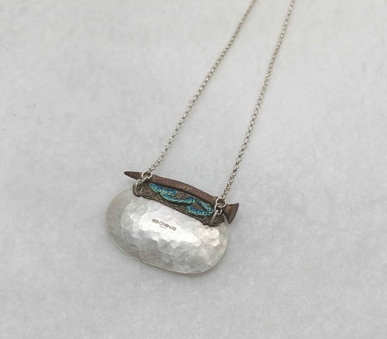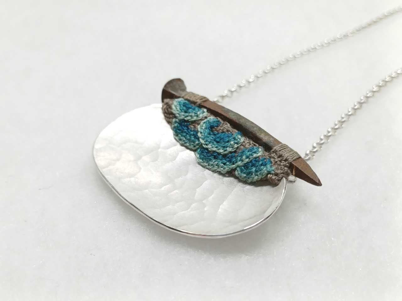 The nails I use for necklaces were handmade several hundred years ago before mechanisation, & come from mudlarking finds along the River Thames. They were used for boat building & for housing, although most of the nails I use come from an area that used to be used for ship breaking - who knows where these nails have been & what they've seen! The shape they are & their patina is how they're found, I form the silver shape, then handstitch the two together with silk threads. Necklaces can be commissioned in a variety of shapes & colours if prefered.